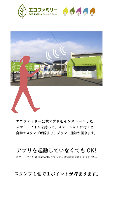 エコファミリー公式アプリをインストールしたスマートフォンを持って、ステーションに行くと自動で1日1スタンプが貯まり、プッシュ通知が届きます。