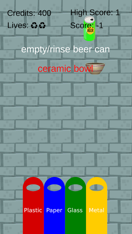 There are 4 connected bins of glass, plastic, metal and paper which can be moved left and right to collect falling items.