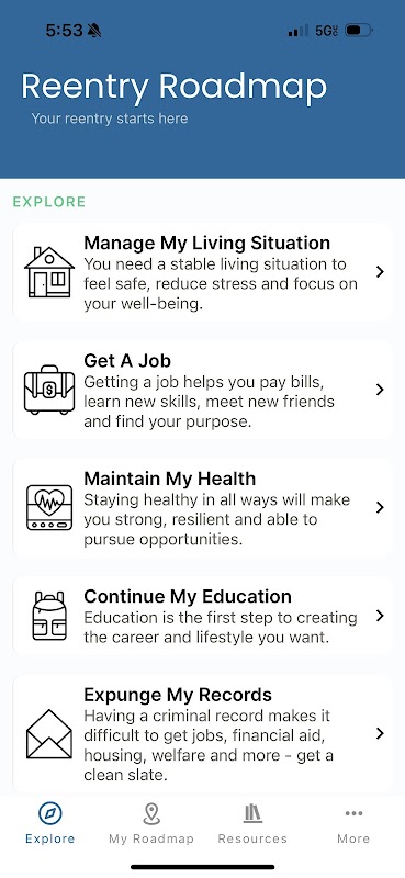 Stellen Sie sich vor, Sie hätten alle Ressourcen, Unterstützung und Anleitung, die Sie benötigen, direkt zur Hand. Mit der Reentry Roadmap wird diese Vision Wirklichkeit. Egal, ob Sie nach Bildungsmöglichkeiten, Beschäftigungsaussichten, Wohnmöglichkeiten oder Unterstützungsdiensten suchen, unsere App ist für Sie da. Verabschieden Sie sich von endlosen Suchen und Sackgassen – mit nur wenigen Fingertipps können Sie auf eine Fülle geprüfter Ressourcen zugreifen, die auf Ihre individuellen Bedürfnisse und Umstände zugeschnitten sind.