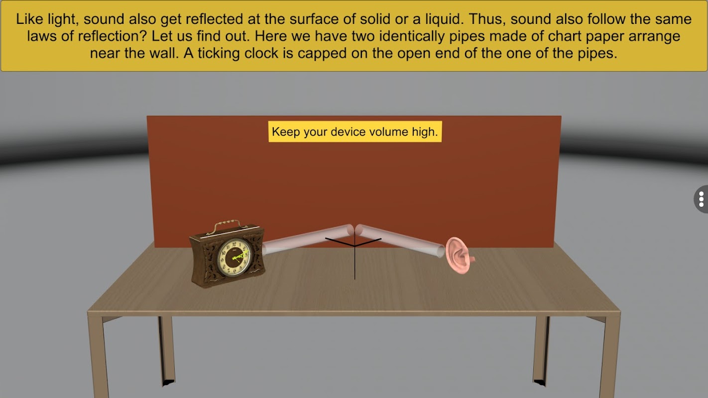 Lassen Sie uns die Angebote der „Reflection of Sound“-App erkunden. Der Benutzer macht sich zunächst mit verschiedenen Glaswaren und Apparaten vertraut, die bei der Schallreflexion verwendet werden. Der Benutzer wird dann von der App mit expliziten Anweisungen zur Durchführung der Aktivität geführt. Diese robuste Anwendung ist ein großartiges Lehr- und Lernwerkzeug für Schüler, Pädagogen und Lehrer, die die Funktionsweise einer Schallreflexion studieren oder lehren möchten.