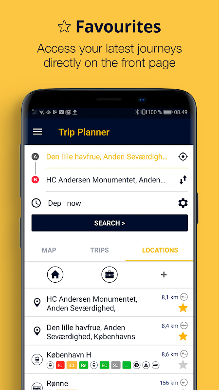 * Suche nach Fahrten zwischen allen Adressen, Bahnhöfen, Haltestellen und Sehenswürdigkeiten in ganz Dänemark
