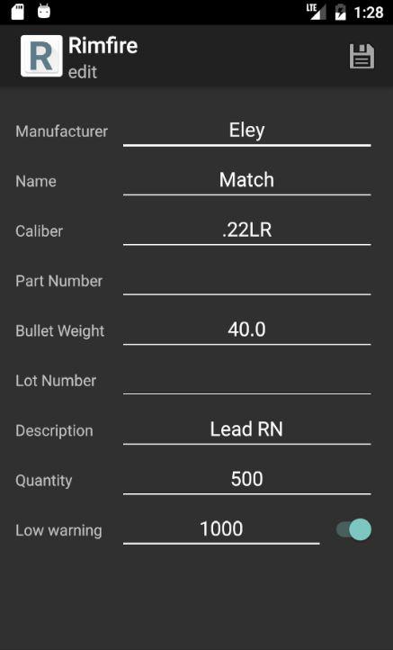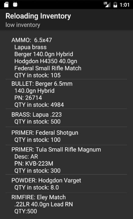 Ebenfalls enthalten ist ein „Low Inventar“ -Liste. Dies kann auch in den Einstellungen ein- / ausgeschaltet werden. Wenn aktiviert, wird ein Feld für jedes Element (Munition, Messing, Kugel, Pulver, Primer und Rimfire) angezeigt, dass Sie eine „low Warnung“ Nummer definieren. Sobald Sie Ihr gesamtes Inventar eingegeben haben, schalten Sie „Inventar anpassen beim Hinzufügen von Munition“ und Inventar von Primern, Kugeln, Messing und Pulver wird automatisch die richtige Menge reduziert werden, wenn Sie die Menge der Munition zu erhöhen. Munition wird reduziert, wenn Sie „schießen“ wählen. Da der Bestand an für Dich wird eingestellt und gehalten Spur, wenn die Menge an einen der konfigurierten Komponenten unter der konfigurierten „low Warnung“ Nummer fällt, wird es automatisch in die „Low Inventory“ Liste hinzugefügt werden. Dies macht das Einkaufen noch einfacher, da Sie nicht über Ihr gesamtes Inventar zu graben, zu wissen, was du bist tief am!