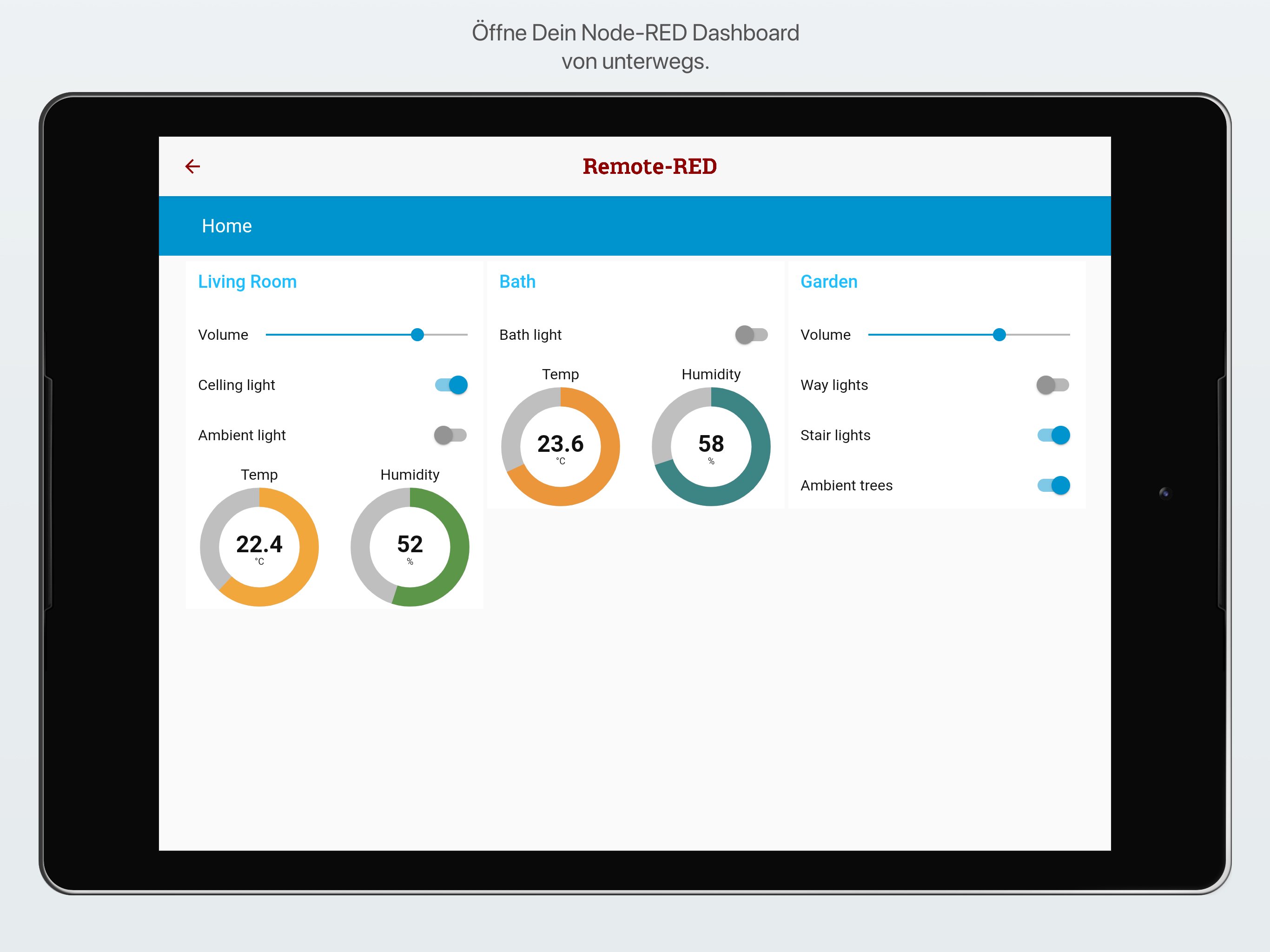 Remote-RED bietet Dir mobilen Zugriff auf Dein Node-RED Dashboard zuhause. Hierzu wird einen Tunnel zwischen Deinem Heim-Netzwerk und Deinem mobilen Gerät erstellt.