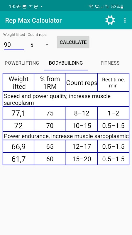 Wiederholte maximale Rechner. Wiederholte Maximum (RM) ist das maximale Gewicht, das auf eine bestimmte Anzahl von Malen angehoben werden kann. Berechnung von 1 bis 40 die Anzahl der repeates durch angegebenen Gewicht für KDK, Bodybuilding und Fitness.