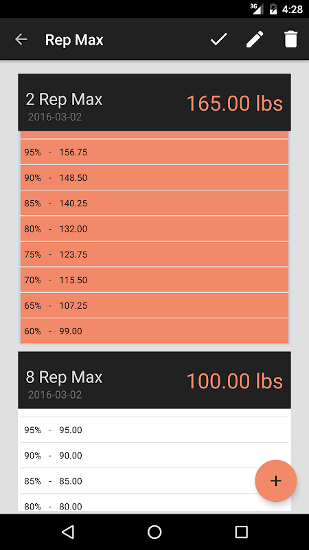 Behalten Sie Ihre Rep Max. Rep Max Tracker ist für Gewichtheben, Olympische Heben und Crossfit. Nachdem Sie Ihre rep max sparen, sehen die Prozentsätze, damit Sie sie nicht berechnen müssen.