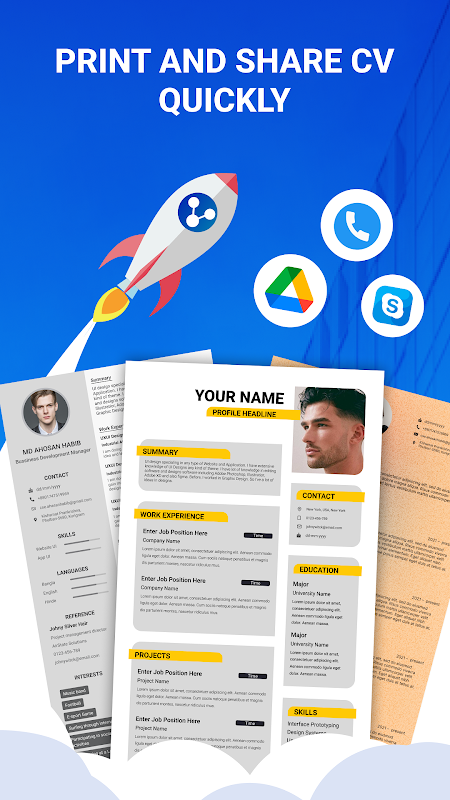 - Schnelles Teilen: Teilen Sie Ihren CV resume sofort über alle Netzwerke mit CV creator