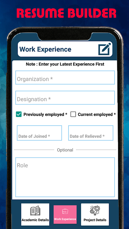 Resume Builder app has a user-friendly interface, as this resume app helps you to fill all the details like work experience and achievements during your working career, your personal hobbies and interests, your academic credentials and professional accomplishments.