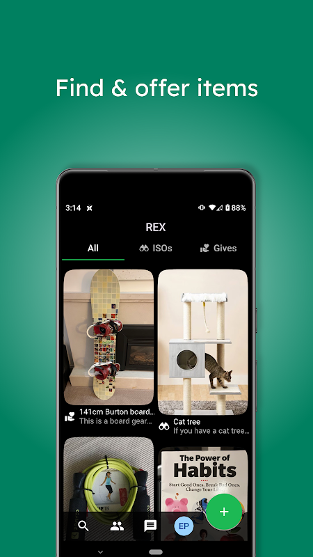 Finden Sie genau das, was Sie brauchen, und verschenken Sie, was Sie nicht brauchen – mit unserer App, die den Ressourcenaustausch in Ihren sozialen Kreisen schnell, einfach und sicher ermöglicht. Suchen Sie mühelos nach Artikeln, die Sie ausleihen, tauschen oder erhalten möchten, und bieten Sie gleichzeitig Ihre eigenen ungenutzten Ressourcen an, um sie mit Freunden, Familie und Kollegen zu teilen. Die intuitive Benutzeroberfläche sorgt für schnelle, problemlose Transaktionen und ermöglicht Ihnen das einfache Finden und Geben von Ressourcen. Bauen Sie eine vernetztere, einfallsreichere Community auf, in der das Teilen und Entdecken nur ein paar Fingertipps entfernt ist.