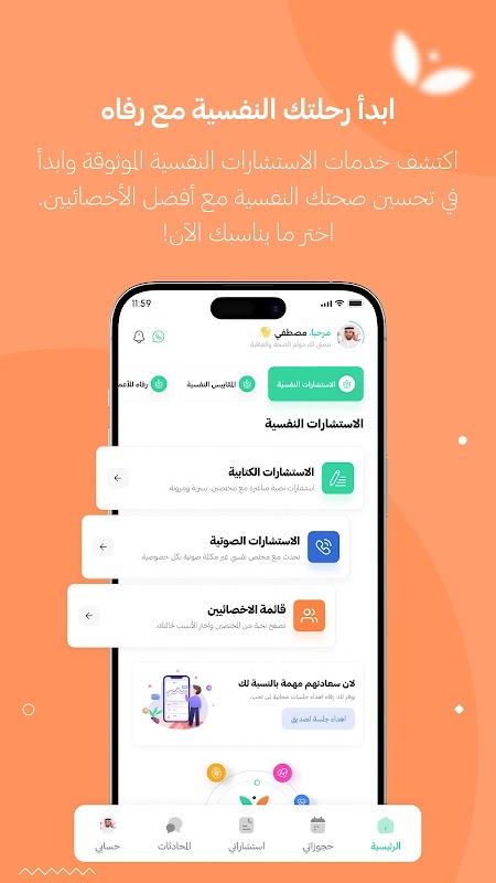 Rafah ist eine spezialisierte App, die psychologische, familiäre und soziale Beratung sowie persönliche Entwicklung mit absoluter Vertraulichkeit und Privatsphäre bietet. Sie verbindet Sie mit zertifizierten Beratern und bietet umfassendere Dienstleistungen, sodass Ihr persönlicher Berater Ihnen näher ist als je zuvor.