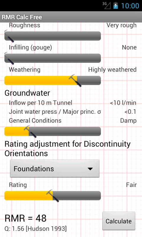 Die Anwendung namens RMR calc kehrt das Gestein Rating (RMR)-Wert und die Einstufung auf Bieniawski (1993) und ermöglicht dem Benutzer, die Ergebnisse per E-Mail.