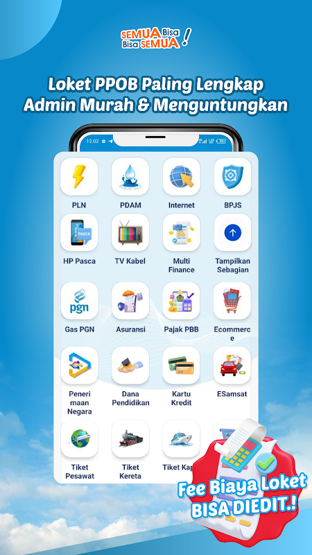 - Postpaid: PLN-Zahlungsschalter, PDAM, komplettes Internet, komplettes BPJS, Postpaid-Mobiltelefone, Kabelfernsehen, Multifinanz, PGN, Versicherung, Grund- und Gebäudesteuer, Staatseinnahmen, Bildungsfonds, E-Samsat, Tickets und Hotels.