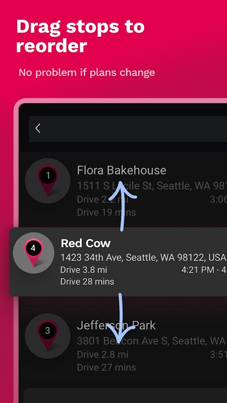 - Ziehen Sie Ihre Stopps per Drag-and-Drop, um Ihre Route in Sekundenschnelle anzupassen
