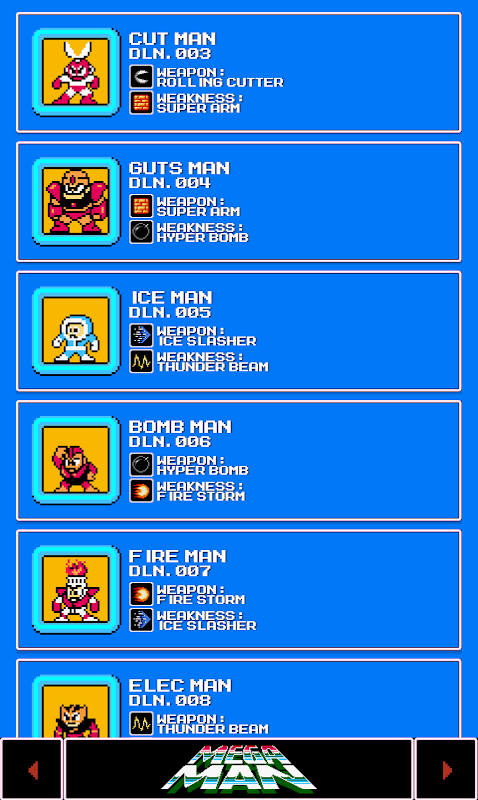 Having trouble defeating the Robot Masters in MEGA MAN? With ROBOT MASTER DATABASE, discover the strengths and weaknesses of the Robot Masters!