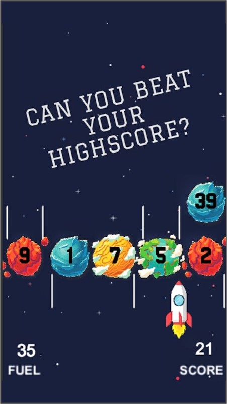 Deine Mission ist sehr einfach. Wische mit deinen Fingern, um deine Rakete durch die Luft und den Weltraum zu führen und brennende Gallonen zu sammeln, die auf dem Bildschirm erscheinen. An jede Treibstoff-Gallone ist eine Zahl angehängt, die anzeigt, wie viel Treibstoff zu Ihrer Rakete hinzugefügt wird. Sie werden mehrfarbige Planeten und Hindernisse mit Zahlen auf ihnen begegnen. Diese Zahlen geben an, wie viel Kraftstoff Sie verlieren, wenn Sie diese Hindernisse treffen, während Sie durch Luft und Raum steuern.