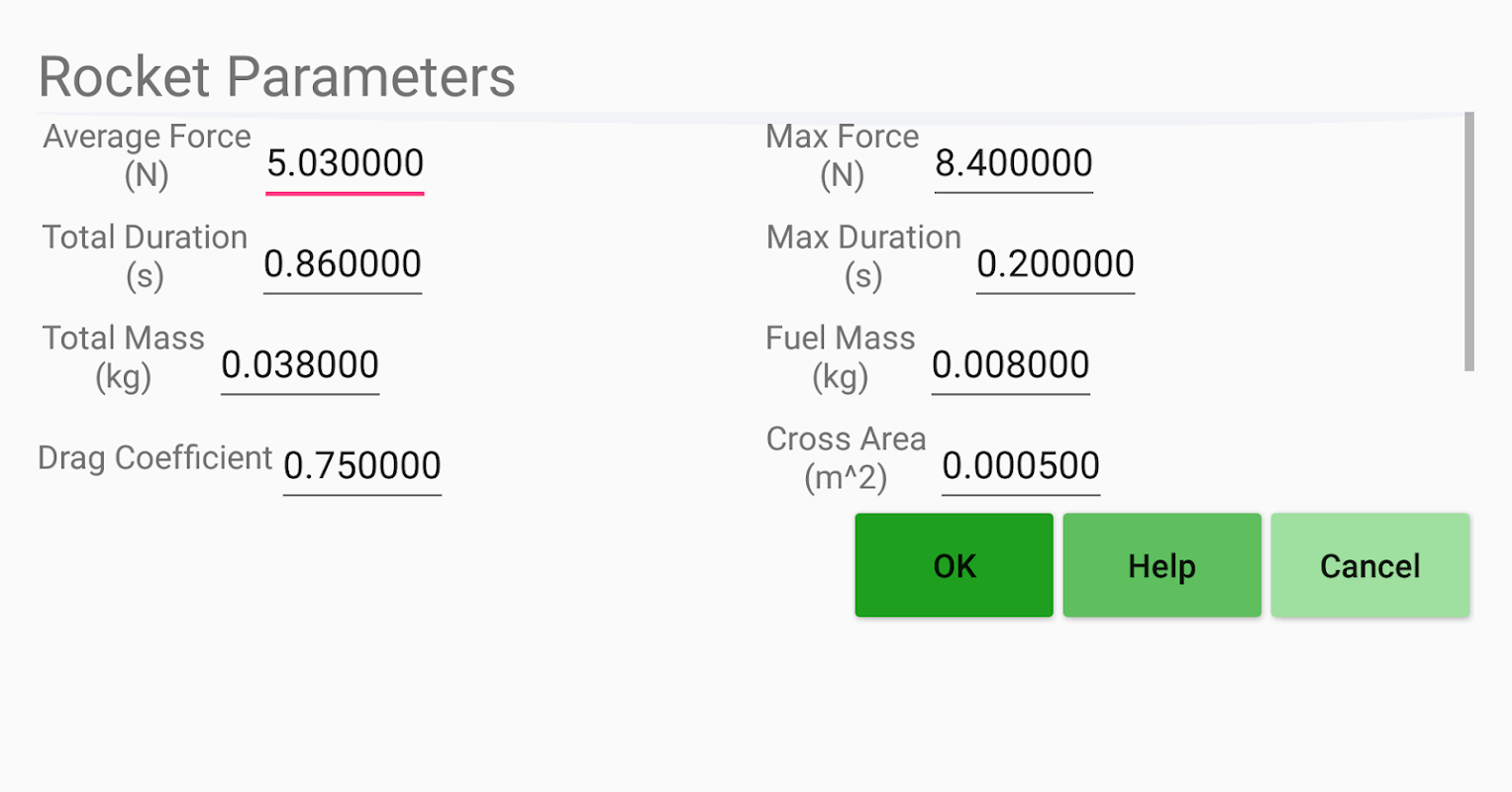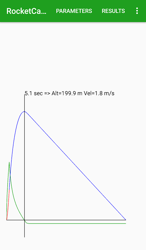 RocketCalc ist ein graphischer Rechner für die Höhe bestimmen und Geschwindigkeit einer Modellrakete wahrscheinlich zu erreichen ist. Geben Sie in RocketCalc die Parameter des Modells Rakete und Raketenmotor. RocketCalc wird dann das wahrscheinliche Flugprofil anzuzeigen. Sie können tippen Sie auf dem RocketCalc Flugprofil Bildschirm während der Raketen Fluges die Höhe und Geschwindigkeit zu einem bestimmten Zeitpunkt zu finden. Die Standardwerte sind für einen B6 Raketenmotor.