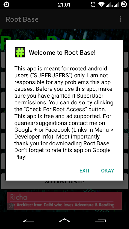 Root Base is compatible with many devices. However, you may face a few occasional bugs on some devices. I do not guarantee that the app will function flawlessly on all devices. I'm working on that, so please do not leave negative reviews! Instead, you can contact me about your issue on Google + or Facebook (Links in the app; Menu > Developer Info).