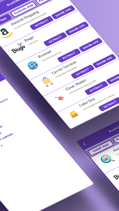 Root Checker - Erweiterte Root Checker-Anwendung hat auch die Option, Ihre Anwendung zu verwalten, mit der Sie Informationen zu installierter App und Systemanwendung finden und auch Ihre aktuell ausgeführte App in Ihrer bevorzugten App mit dem App-Manager speichern können Sie können Ihre Datei direkt extrahieren oder direkt von Ihrem mobilen Gerät deinstallieren und die Share-Funktion mit der Share-Taste direkt teilen.