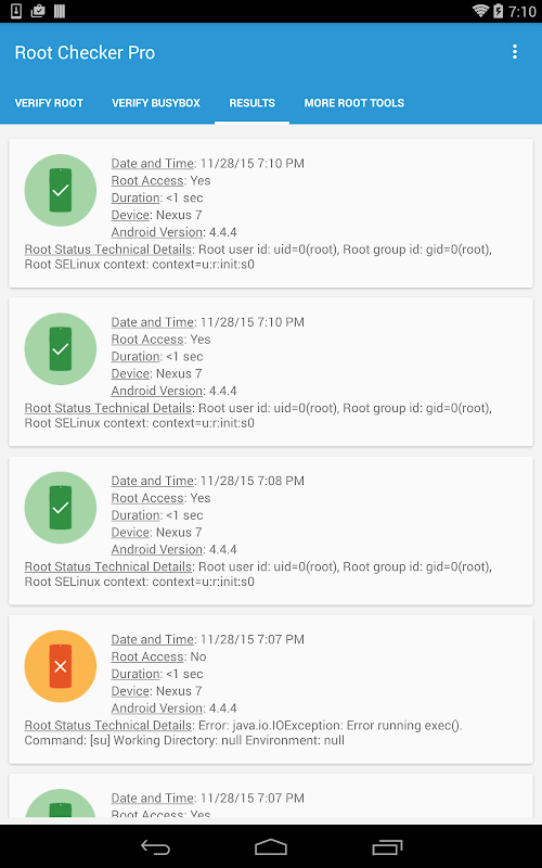 Der Root-Check-Modus zeigt die wichtigsten Informationen bei der Bestimmung, ob root (Superuser) Zugang ordnungsgemäß installiert wurde: Standard su binäre Standorte und Dateiberechtigungen, Wurzel UID / GID (Benutzer-ID / Gruppen-ID) und SELinux Kontext Ergebnisse, Superuser-Anwendungsinstallationen und Version, adb shell Standardbenutzermodus (Shell oder Root-Benutzer), SELinux-Status (der Durchsetzung oder nicht) und die PATH-System definiert.