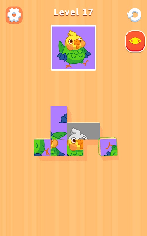 The blocks are all disordered, rotate each to its right position so that you can get the same block as the tip and solve the puzzle.