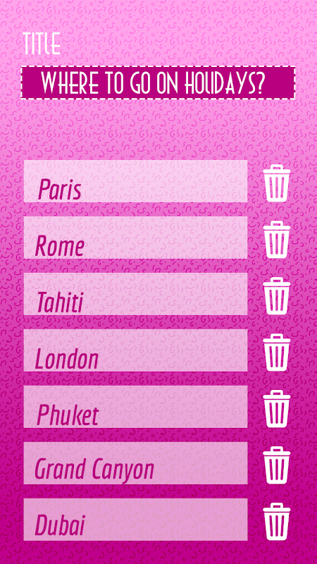 🍀 Personalisieren Sie einfach Ihren "Zufallsgenerator"! Entscheidungs Roulette - Glücksrad App ist ein perfektes Glücksrad, das Ihnen zeigt, dass es nicht immer schwierig ist, gute Entscheidungen zu treffen. Drücken Sie einfach die Drehknopf-Taste, und diese Zufallsauswahl erledigt die ganze Arbeit für Sie! Laden Sie diesen virtuellen Spinnrad-Simulator kostenlos herunter und verwenden Sie ihn viele Male! Dieser "Lotto Zufallsgenerator" kann vielfältig eingesetzt werden - verlassen Sie sich auf Ihre Kreativität! Dieser Auswahlgenerator wird bald zu Ihrem besten Freund und Sie sollten ihn jedes Mal konsultieren, wenn Sie Zweifel haben!