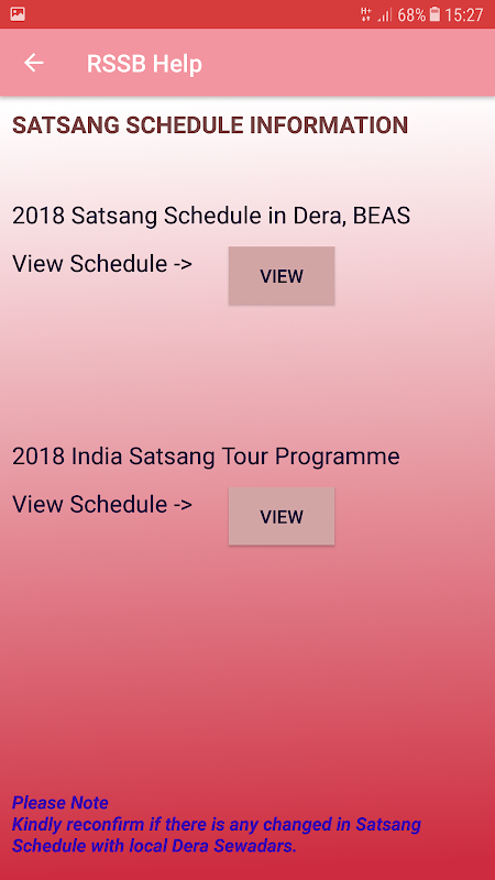 * Accommodation Status - This feature require SMS permission to Send and Receive SMS from DERA server that will let Sangat to know about their Accommodation Booking or Enquiry Status if someone has applied or wishes to enquire for accommodation at Dera Beas during Satsang programme.