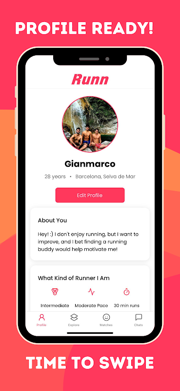 Runn ist das Tinder für Läufer – swipe durch lokale Athleten, matche basierend auf deinen Vorlieben und lauft gemeinsam los. Egal, ob du deine Marathon-Bestzeit anstrebst oder einfach nur einen netten Laufpartner suchst – Runn hilft dir, den perfekten Partner zu finden.