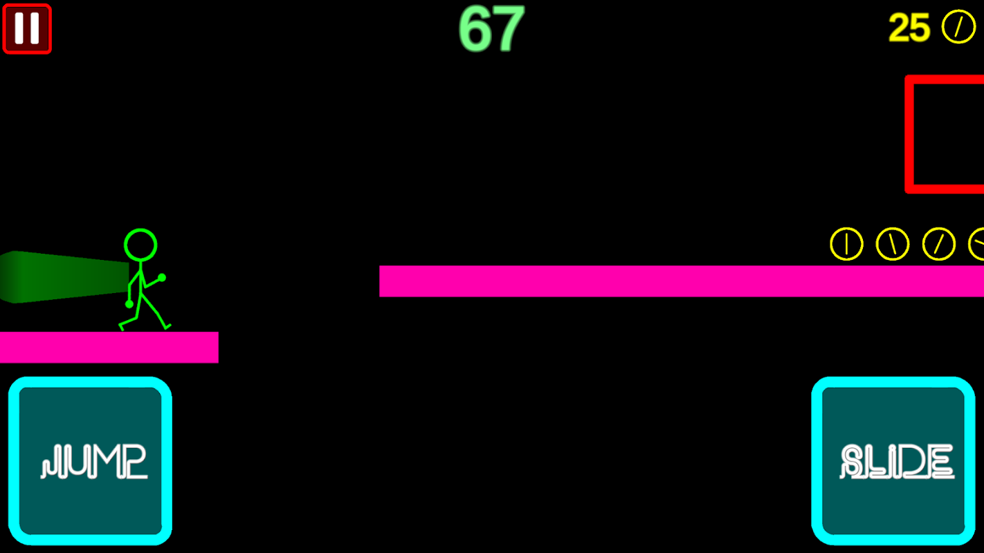 Use your stickman to run, jump and slide across the path. Avoid blocks which will destroy you and chasms which will consume you. Collect coins to get cooler characters and try to last for as long as possible and get the highest score.