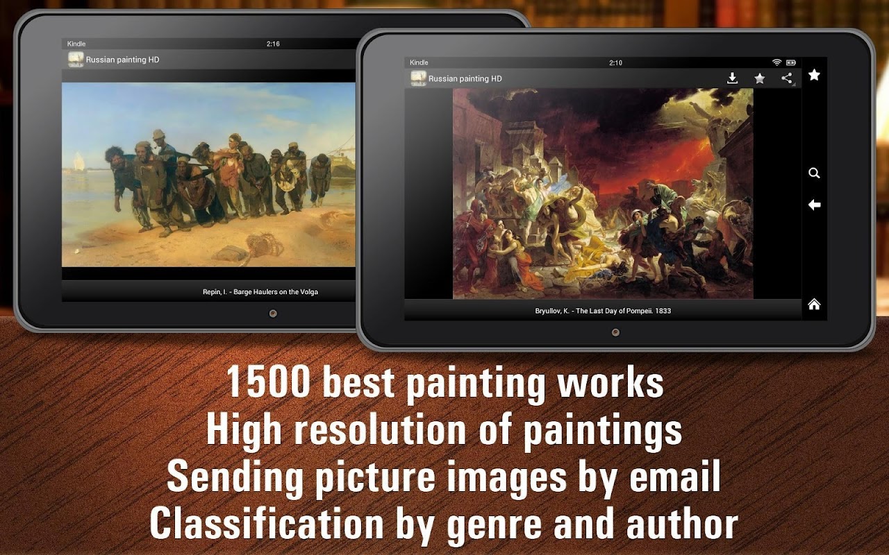 Die Anwendung enthält 1500 Werke von 250 größten russischen Maler - Aivazovsky, Schischkin, Savrasov, Repin, Levitan, Vrubel, Roerich, Surikov, Vasiliev und andere berühmte Maler.