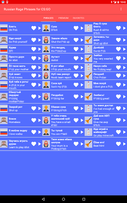 If you have ever played Counter-Strike: Global Offensive (CS:GO), you have probably encountered Russians that do not understand a thing in English. CS:GO is a team game, so you have to adjust and put all the efforts to efficiently communicate with the team and get the win. This app helps you to achieve that. It contains the most common rage phrases that Russians use in CS:GO. You can use this app to express your feelings and have a good time with your Russian teammates.