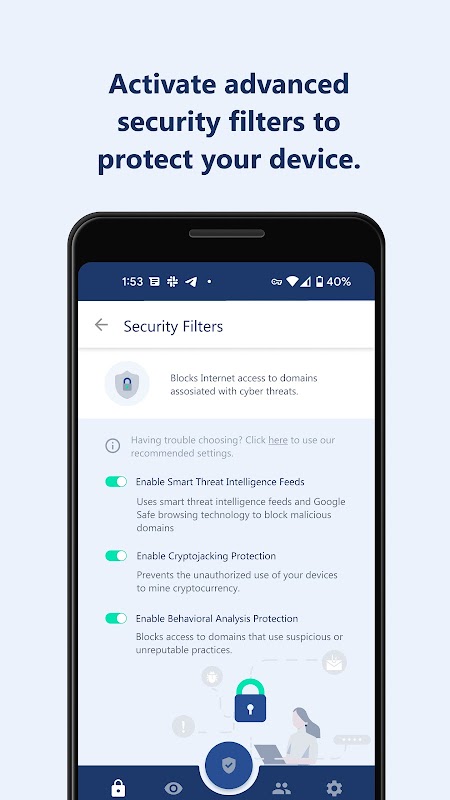 Kontrollieren Sie die Internetverbindung Ihres Geräts und wählen Sie aus, was blockiert werden soll: Werbung, Tracker, schädliche Websites, Daten- und Datenschutzlecks, nicht jugendfreie und unangemessene Inhalte für Kinder und vieles mehr.