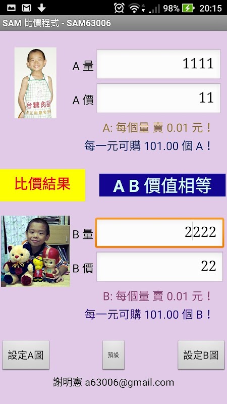 1.依據兩物品的 [量] 及 [價] ,迅速告知使用者哪個較便宜!