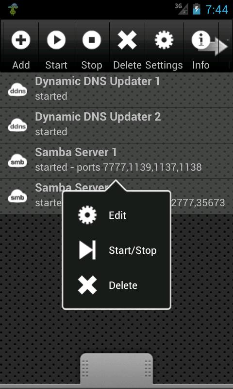 - For every Samba Server you can set name, TCP/IP port, session port, name server port, datagram port, multiple directories to share, use root for internal port forwarding, enable logging, only log errors, start the server when connected to a specific WIFI network and disconnect when the WIFI network is lost, or start on boot