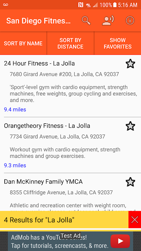 • List of fitness centers with street addresses, descriptions and distance to your location
