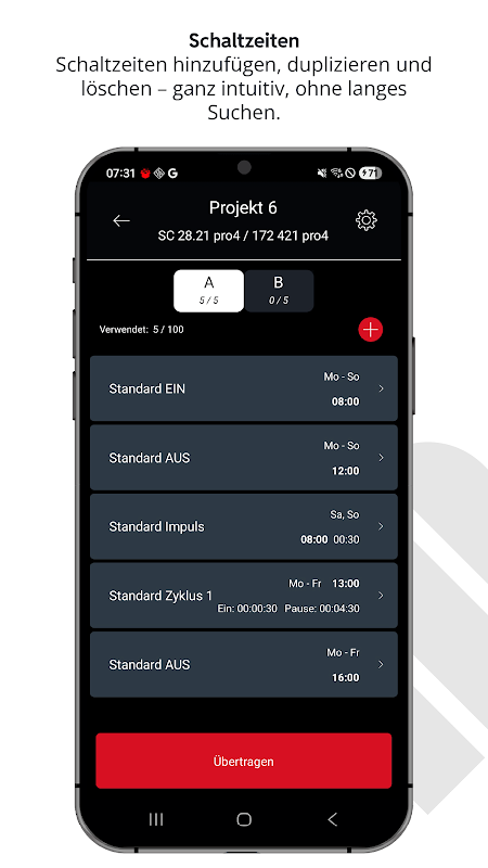 Erstelle mit Hilfe unserer Save'n Carry App im Handumdrehen Schaltprogramme für deine easy- sowie pro4-Schaltuhren. Übertragen Sie diese ganz einfach per NFC bzw. Bluetooth auf Ihrem gewünschten Gerät.