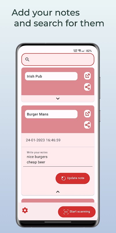Nie wieder müssen Sie sich Sorgen machen, ein Bar-Menü zu verlieren oder durch einen Stapel Menüs zu blättern, um das zu finden, das Sie suchen, oder noch schlimmer… der QR-Code einer Bar oder eines Restaurants ist nicht auf dem Tisch, und Sie müssen Zeit verschwenden, um einen zu bekommen. Mit unserer Barcode-Scanner-App können Sie die Barcodes Ihrer Lieblingsbar-Menüs ganz einfach scannen und an einem Ort speichern, um schnell und einfach darauf zugreifen zu können. Darüber hinaus ermöglicht unsere App die Suche nach Ihren Bar-Menüs nach Bar-Namen oder nach hinzugefügten Notizen, sodass Sie das gewünschte Menü jederzeit leicht finden können.