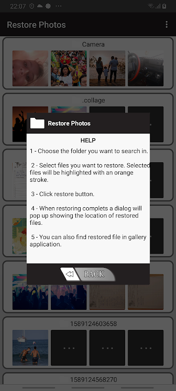 Starten Sie einfach die App und lassen Sie sie eine Weile nach Bildern suchen. Wenn sie fertig ist, können Sie auswählen, welche wiederhergestellt werden sollen.