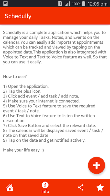 Schedully ist eine vollständige Anwendung, mit der Sie Ihre täglichen Aufgaben, Notizen und Ereignisse im Kalender verwalten können. Sie können einfach wichtige Termine hinzufügen, die durch Tippen auf das festgelegte Datum verfolgt und angezeigt werden können. Diese Anwendung ist auch mit der Funktion "Voice to Text" und "Text to Voice" integriert. Damit können Sie es leicht verwenden.