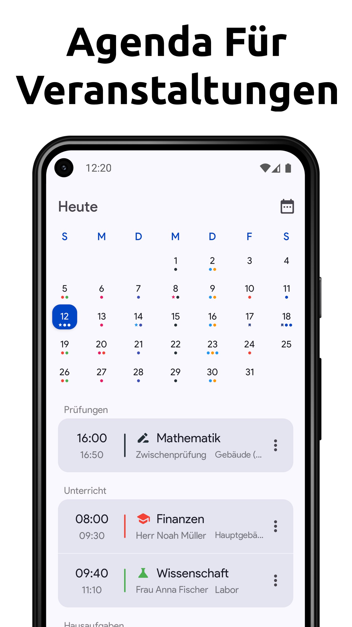 Du kannst deinen Unterricht, Hausaufgaben und Prüfungen einfach erstellen und verwalten. Alles wird in deiner Agenda angezeigt, wo du deinen täglichen Plan finden kannst. Von dort aus kannst du deine Veranstaltungen verwalten oder einen einzelnen Unterricht im Falle eines Notfalls absagen.