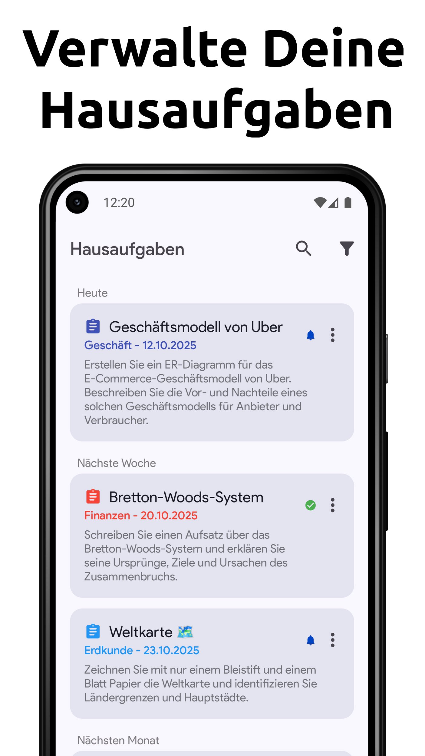 Der Schulplaner wurde entwickelt, um dir zu helfen, alle deine Hausaufgaben einfach und intuitiv zu verfolgen. Du kannst deine Hausaufgaben nach Datum, Fach oder Priorität sortieren oder sie als abgeschlossen oder nicht abgeschlossen kategorisieren.