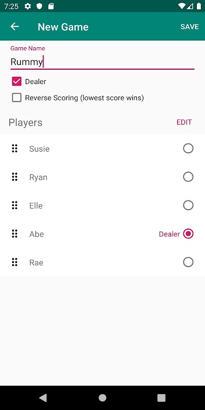 Erhalte die Punktzahl, indem du ein Spiel erstellst und einige Spieler hinzufügst. Wählen Sie einen Ersthändler aus oder ob es überhaupt einen Händler gibt! Bei Spielen kann auch die Wertung umgekehrt werden, sodass der Spieler mit der niedrigsten Wertung gewinnt. Visualisieren Sie die Punktzahl eines Spiels, indem Sie sich die Grafik ansehen.