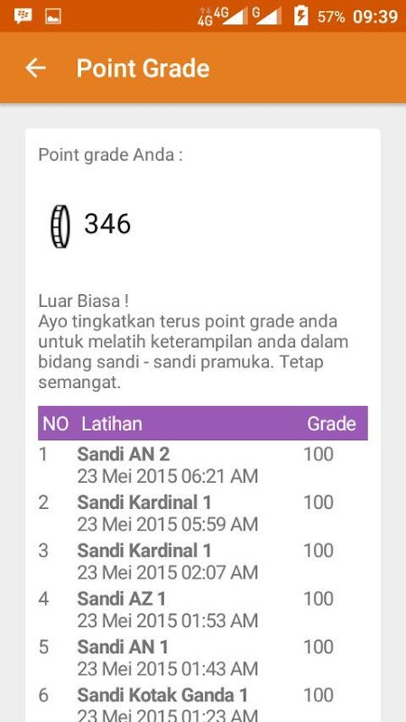 Fitur Latihan menguji keterampilan anda tentang Semaphore, Morse dan Sandi - sandi dalam pramuka. Untuk menggunkan fitur ini anda harus terkoneksi internet dan harus login terlebih dahulu. Fitur Latihan ini akan menghasilkan grade setiap kali anda mengerjakan latihan. Grade tersebut bisa anda kumpulkan sebanyak banyak nya, karna semakin banyak grade yang terkumpul maka semkin mahir keterampilan anda tentang Semaphore, Morse dan Sandi - sandi dalam pramuka.