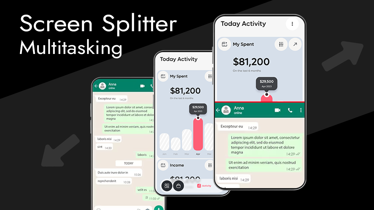 Mit Screen Splitter Multitasking , das intelligent auf Ihrem Smartphone funktioniert, können Sie gleichzeitig arbeiten, was die Zeit verkürzt und produktive Arbeit leistet.