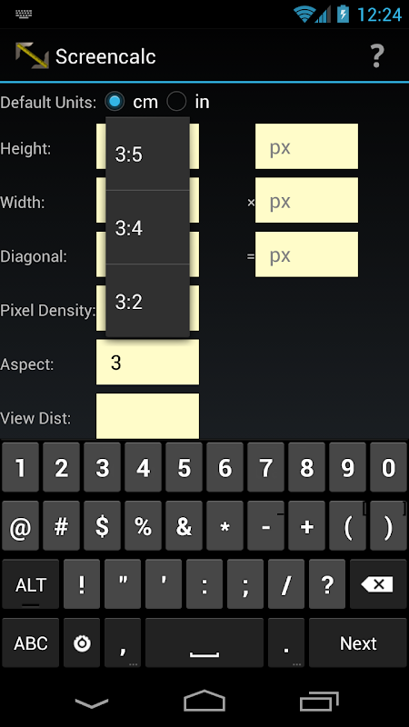 Berechnet Display-Parameter: Breite, Höhe, Diagonale, Pixeldichte usw.