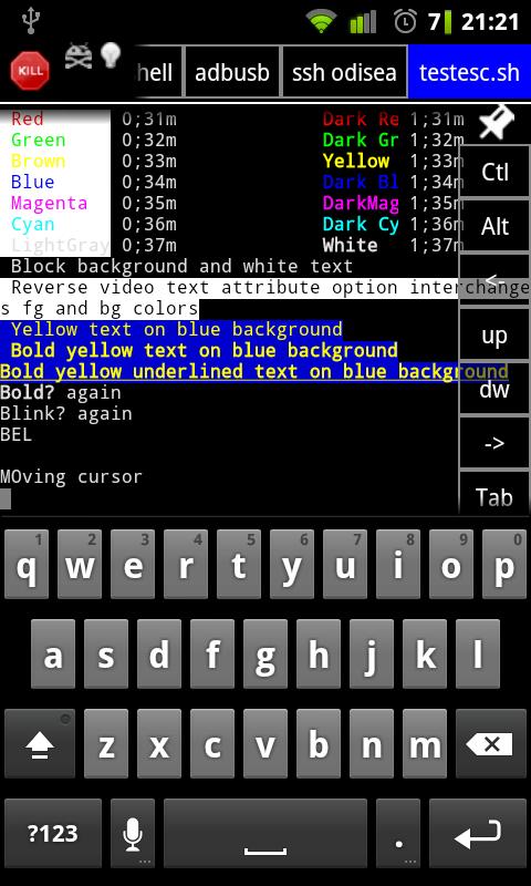 Aktivieren Sie "extra Gesten" in config Bildschirm, um Home / End, del / tab, links / rechts, pgup / PgDown Schlüssel senden. Dies ist sehr nützlich, um Schale und ssh-Verbindungen auszuführen.