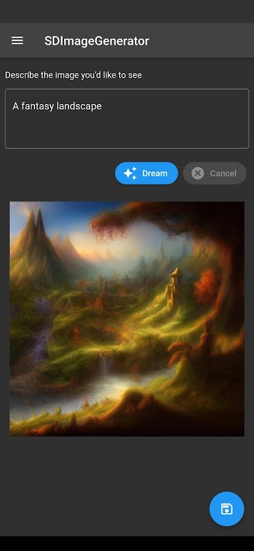 SDImageGenerator ist eine Text-zu-Bild-Generierungs-App für künstliche Intelligenz. Beschreiben Sie einfach Ihr Bild, zum Beispiel „eine Fantasielandschaft“, und tippen Sie auf die Traumschaltfläche.