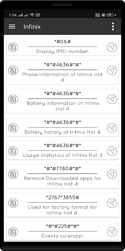 Die Anwendung umfasst die folgenden mobilen Geheimcodes :