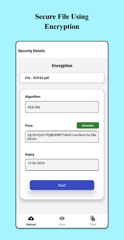 Verwalten Sie Ihre freigegebenen Dateien ganz einfach mit Secure Share. Alle notwendigen Details, einschließlich Verschlüsselungsalgorithmus und Passwort, werden sicher auf Ihrem Gerät gespeichert. Rufen Sie Dateien mit dem bereitgestellten eindeutigen Suchschlüssel ab und entschlüsseln Sie sie.