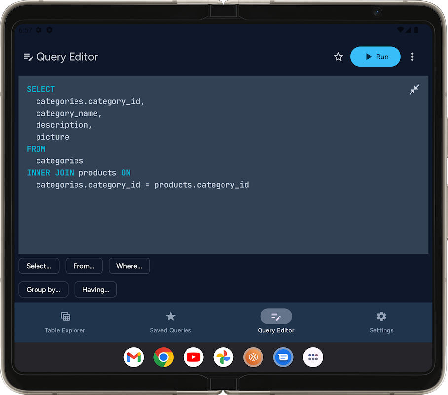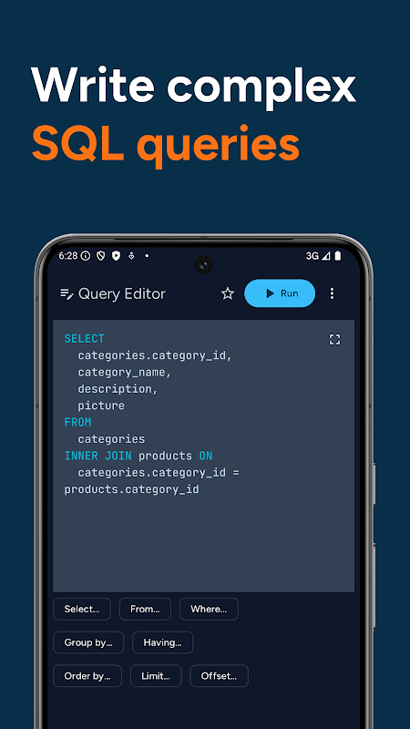 - Schreiben Sie SQL-Abfragen mit dem mobilfreundlichen SQL-Editor oder schreiben Sie SQL-Abfragen manuell.