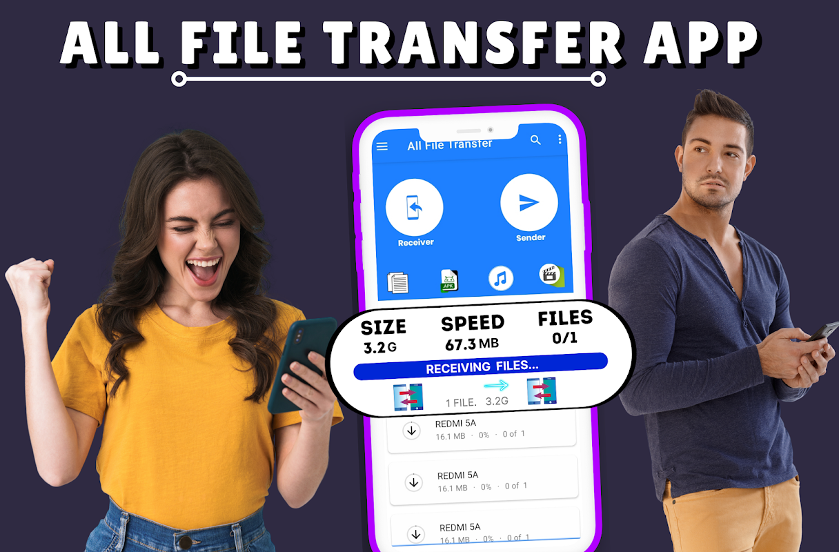 With this Sender All File Transfer App, you can instantly send and receive files ( Secure file transfer) irrespective of the File Size like Big Movies, and Videos with 300 times Faster Speeds than Bluetooth transfer without Wifi Connectivity and any interruption and loss in file transfer speed.