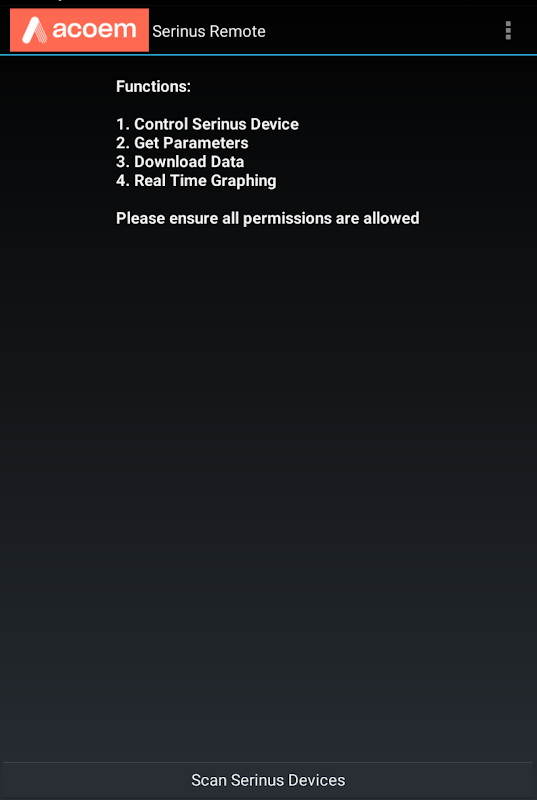 Mit Acoem Serinus Remote können Sie Ihr Bluetooth-fähiges Analysegerät der Serinus-Serie von Ihrem Android-Telefon oder -Tablet aus fernsteuern. Ermöglicht die vollständige Steuerung aller Serinus-Instrumente über den Android-Touchscreen. Zu Diagnosezwecken kann eine Momentaufnahme der Serinus 200+-Parameter angezeigt und per E-Mail verschickt werden. Die Anwendung unterstützt außerdem Echtzeit-Plots von bis zu 4 Parametern sowie das Herunterladen und Plotten von Daten, die bereits im internen USB-Speicher des Serinus aufgezeichnet wurden.